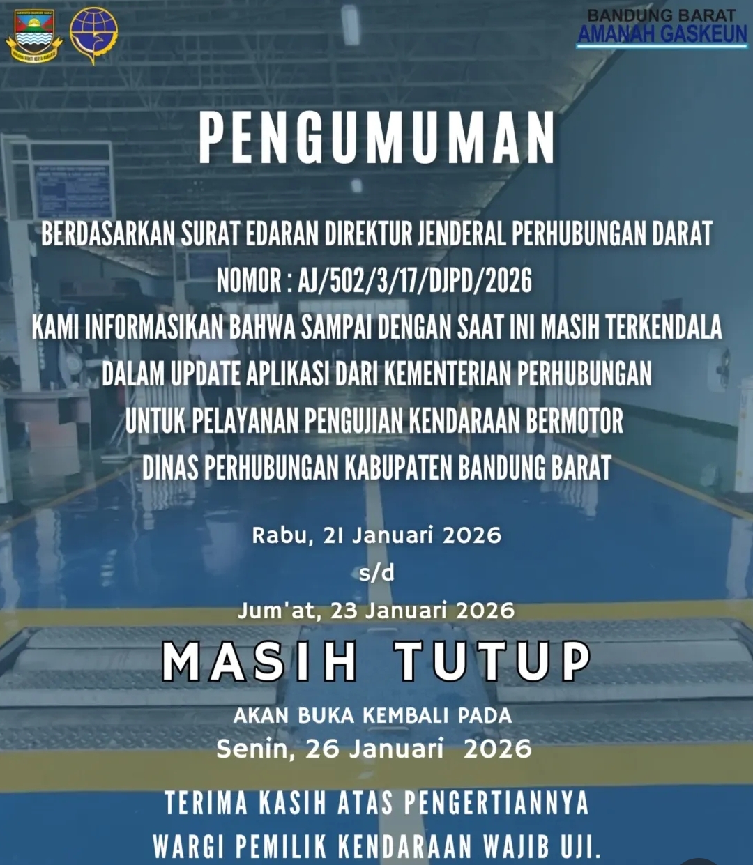 Bandung Barat -WarnaJembar.com // Dinas Perhubungan (Dishub) Kabupaten Bandung Barat (KBB) untuk sementara waktu menutup layanan pengujian kendaraan bermotor atau uji KIR. Penutupan ini dilakukan akibat adanya kendala pembaruan sistem aplikasi pengujian yang terintegrasi secara nasional dengan Kementerian Perhubungan.